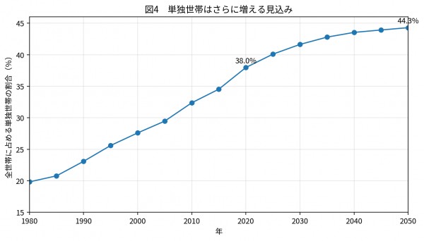 単独世帯は2020年の38.0%から、2050年には44.3%へ上昇します。