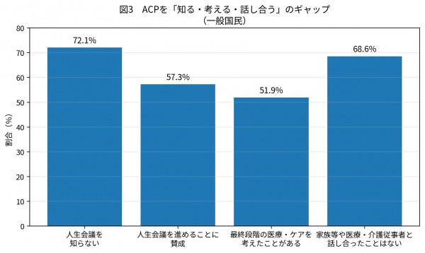 厚生労働省の同調査では、一般国民の72.1%が人生会議を「知らない」と答え、